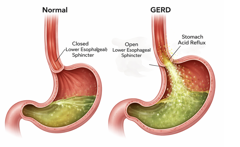 GERD occurs when the lower esophageal sphincter (LES) — a muscular valve between the esophagus and stomach — relaxes or weakens at inappropriate times. This allows acid to travel upward.
